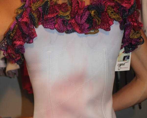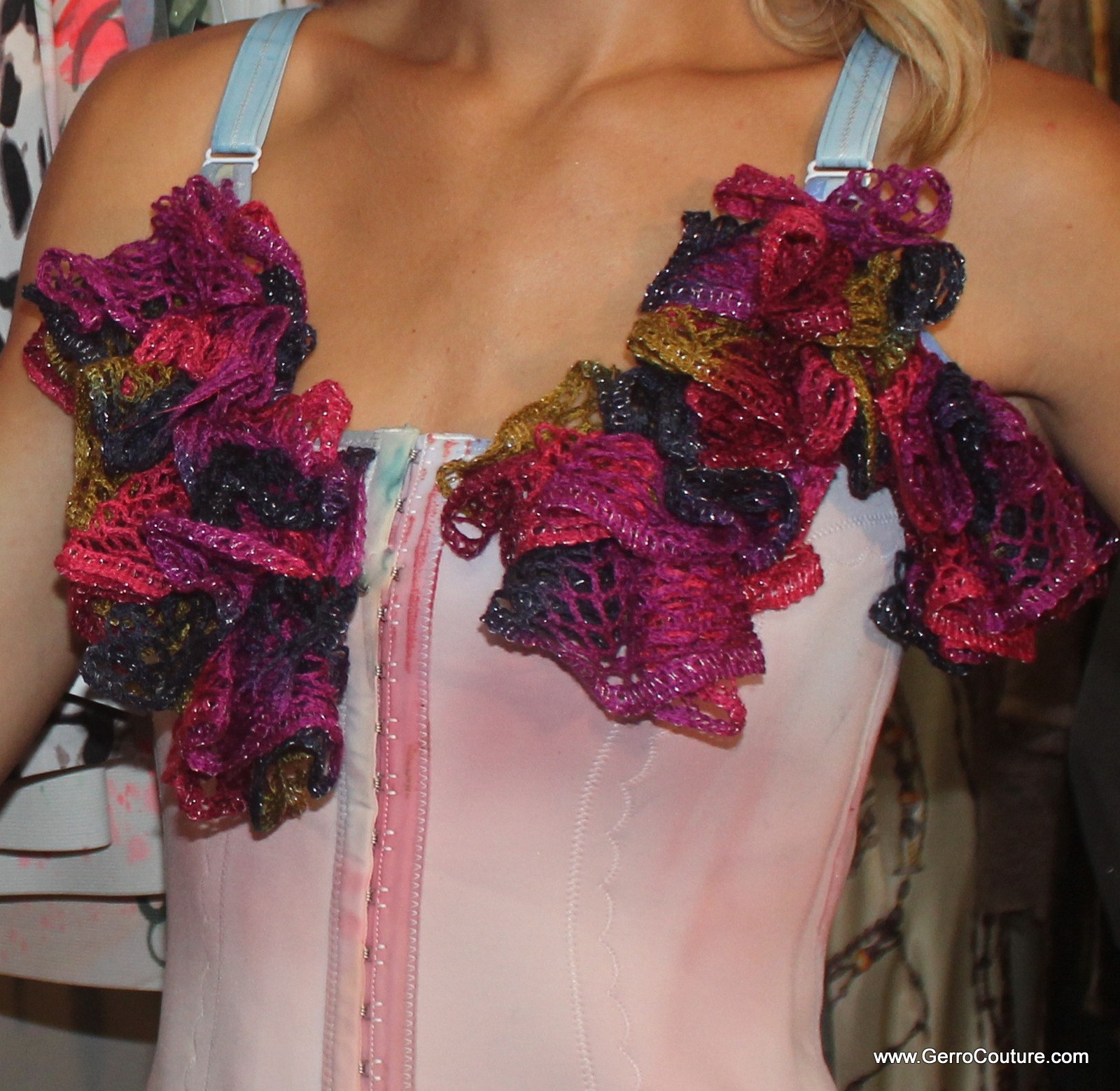 One of a kind hand painted with crochet trim, reversable, boning, sized xsmall to large, spandex body shaper, hand wash and drip dry,