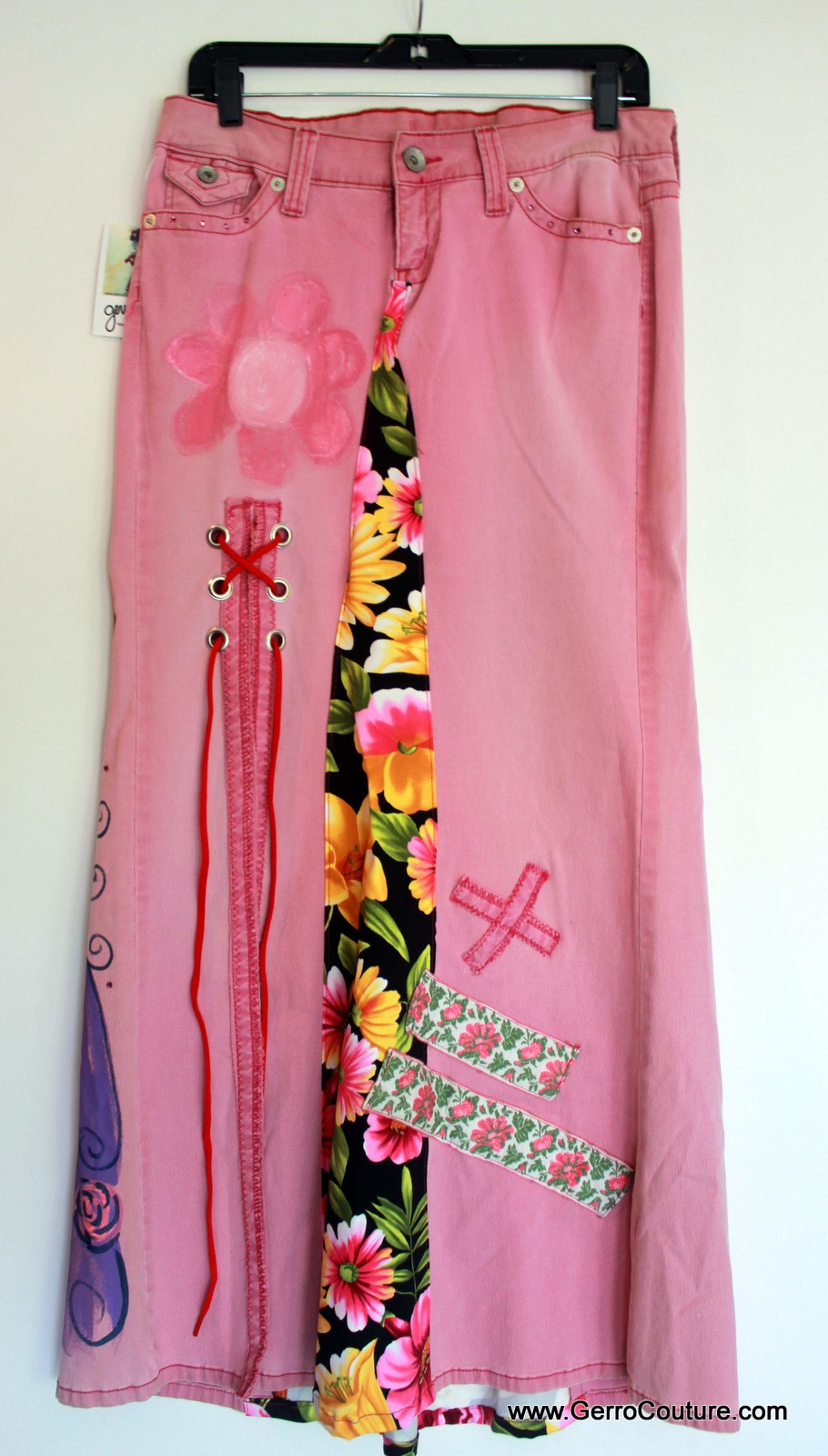 One of a kind hand painted jeans converted into a mermaid cut jean skirt, diva on the back, side slit red laces, $189.00 machine wash and dry.