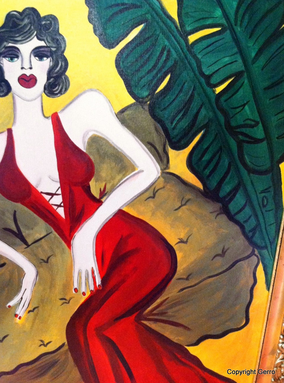 Original painting acrylic on canvas 24"x36"x1" red dress and lounging palms Miami setting.