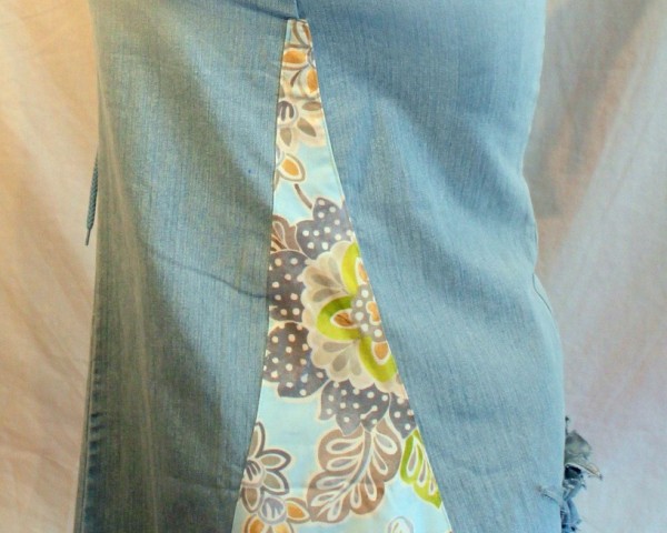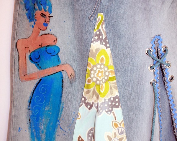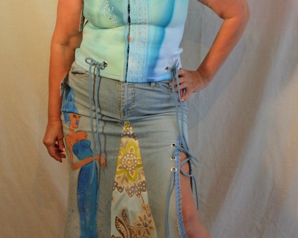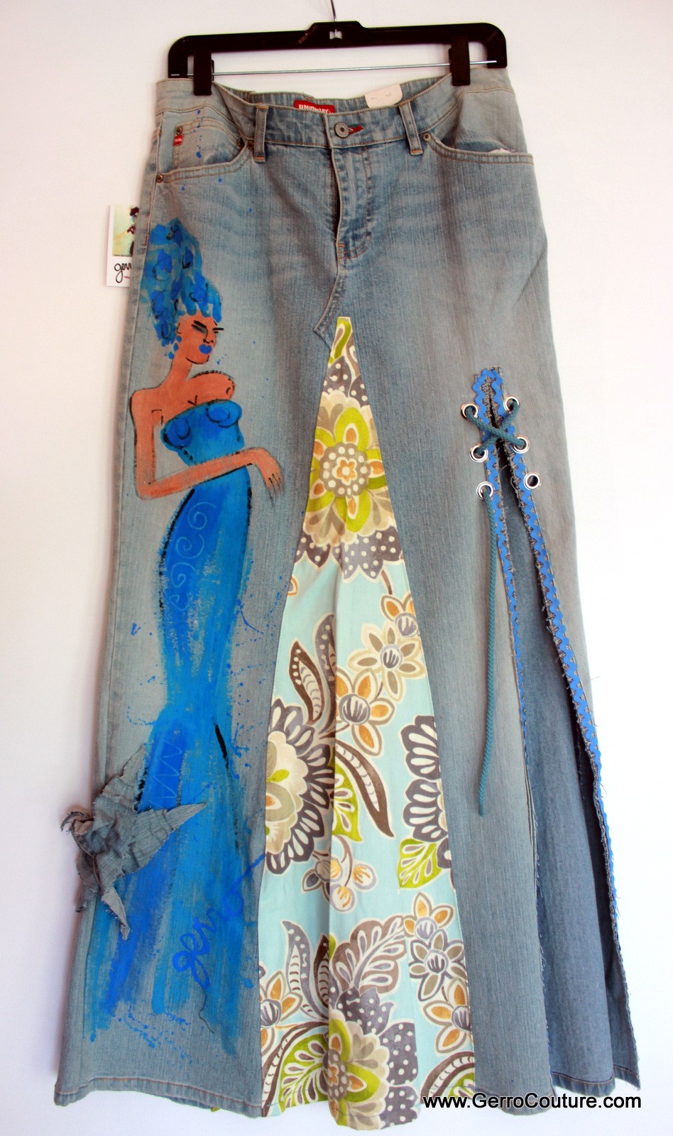 One of a kind hand painted blue diva jean skirt mermaid cut, blue floral inserts front and back, side slit rick rack trim show some leg, size 12/14, machine wash inside out and dry.