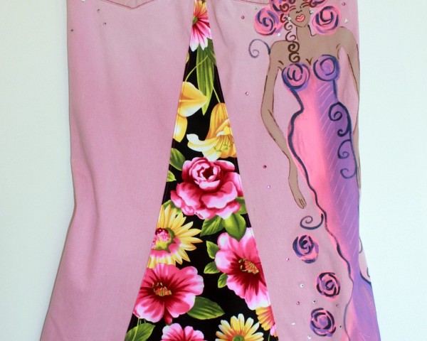 One of a kind hand painted jeans converted into a mermaid cut jean skirt, diva on the back, side slit red laces, $189.00 machine wash and dry.